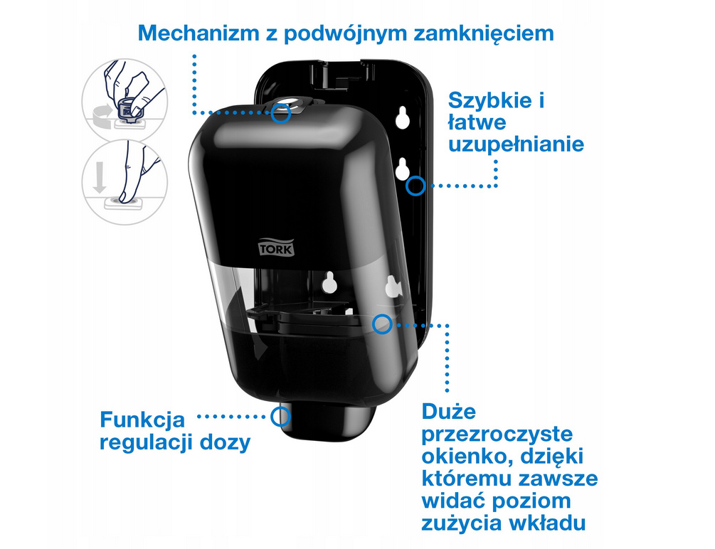 Kluczowe zalety Tork 565208 Dozownik do Mydła/Dezynfekcji Mini S5 Elevation Czarny: